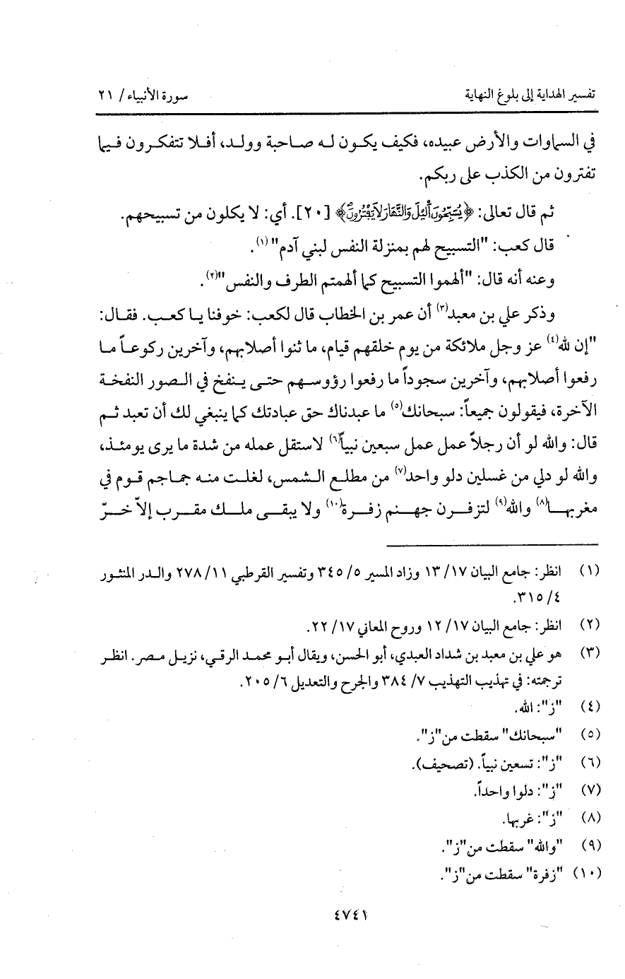 وذكر علي بن معبد أن عمر بن الخطاب قال لكعب: خوفنا يا كعب. قال: " إن لله D ملائكة من يوم خلقهم قيام، ما ثنوا أصلابهم، وآخرين وركوعاً ما رفعوا أصلابهم، وآخرين سجوداً ما رفعوا رؤوسهم حتى ينفخ في الصور النفخة الآخرة، فيقولون جميعاً: سبحانك ما عبدناك حق عبادتك كما ينبغي لك أن تعبد ثم قال: والله لو أن رجلاً عمل عمل سبعين نبياً لا ستقل عمله من شدة ما يرى يومئذ، والله لو دلي من غسلين دلو واحد من مطلع الشمس، لغلت منه جماجم قوم من مغربها والله لتزفرن جهنم زفرة ولا يبقى ملك مقرب إلاّ خرّ