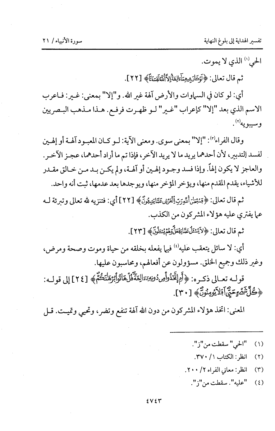 وقال الفراء: " إلا " بمعنى سوى. ومعنى الآية: لو كان المعبود آلهة أو إلهين لفسد التدبير، لأن أحدهما يريد ما لا يريد الآخر، فإذا تم ما أراد أحدهما، عجز الآخر. والعاجز لا يكون إلهاً. وإذا فسد وجود إلهين أو آلهة، ولم يكن بد من خالق مقدر للأشياء، يقدم المقدم منها، ويؤخر المؤخر منها، ويوجدها بعد عدمها، ثبت أنه واحد.