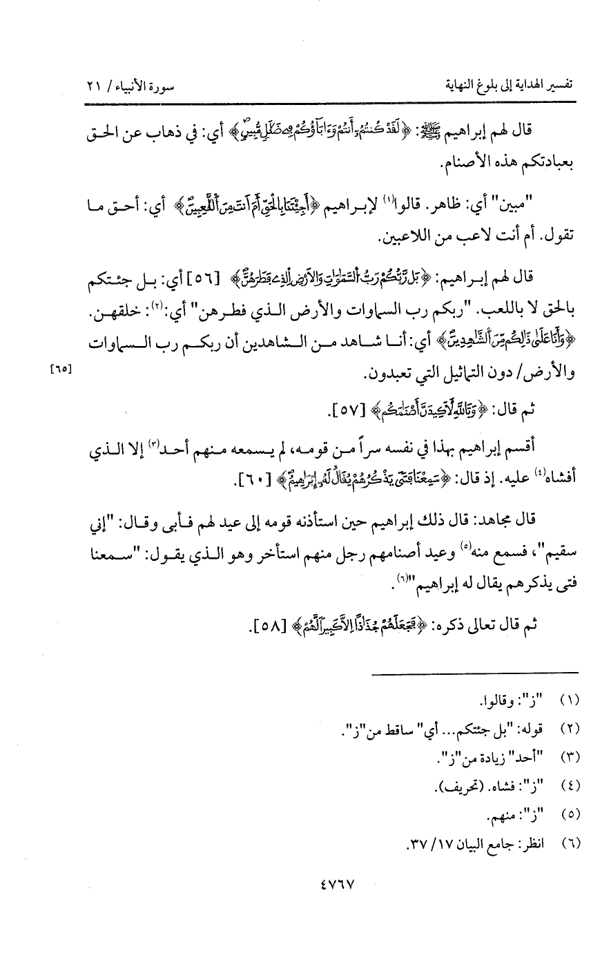 قال لهم إبراهيم: {بَل رَّبُّكُمْ رَبُّ السماوات والأرض الذي فطَرَهُنَّ} أي: بل جئتكم بالحق لا باللعب. " ربكم رب السماوات والأرض الذي فطرهن " أي: خلقهن. {وَأَنَاْ على ذلكم مِّنَ الشاهدين} أي: أنا شاهد من الشاهدين أن ربكم رب السماوات والأرض/ دون التماثيل التي تعبدون.