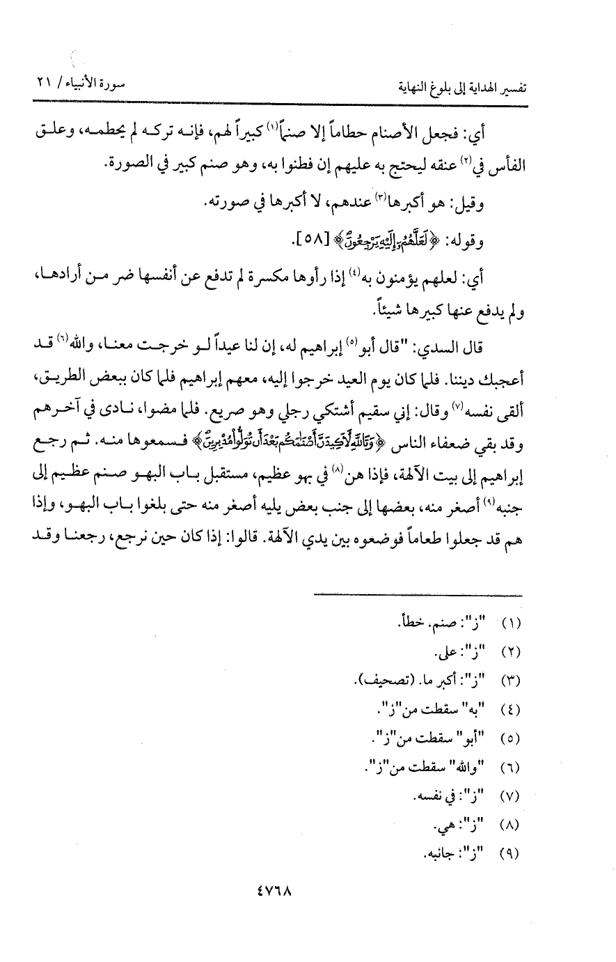 فلما مضوا، نادى في آخرهم وقد بقي ضعفاء الناس {وتالله لأَكِيدَنَّ أَصْنَامَكُمْ بَعْدَ أَن تُوَلُّواْ مُدْبِرِينَ} فسمعوها منه. ثم رجع إبراهيم إلى بيت الآلهة، فإذا هن في بهو عظيم، مستقبل باب البهو صنم عظيم إلى جنبه أصغر منه، بعضها إلى جنب بعض يليه أصغر منه حتى بلغوا باب البهو، وإذا هم قد جعلوا طعاماً فوضعوه بين يدي الآلهة. قالوا: إذا كان حين نرجع، رجعنا وقد