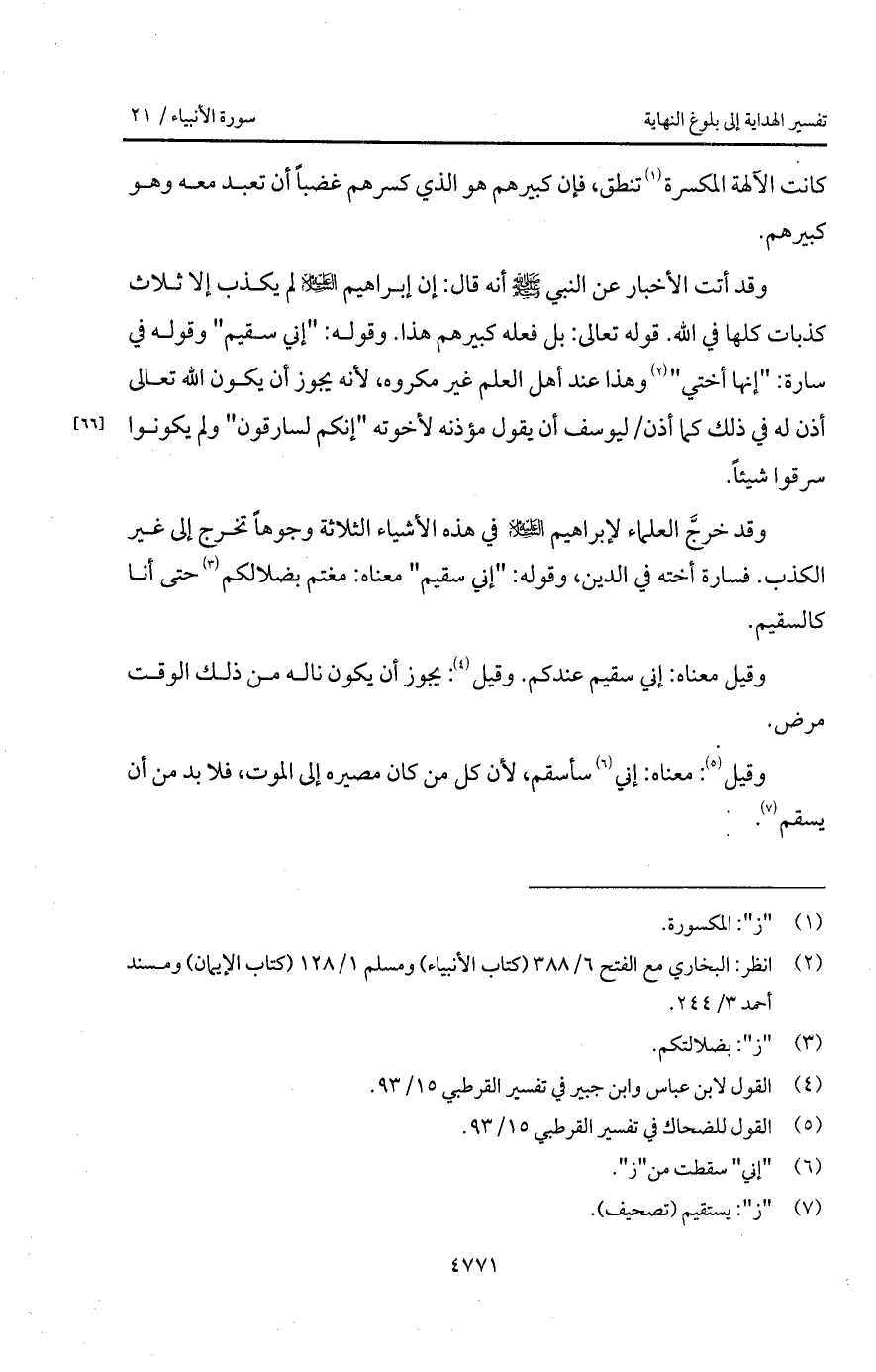 وقد خرجَّ العلماء لإبراهيم عليه السلام الأشياء الثلاثة وجوهاً تخرج إلى غير الكذب. فسارة أخته في الدين، وقوله: " إني سقيم " معناه: مغتم بضلالكم حتى أنا كالسقيم.