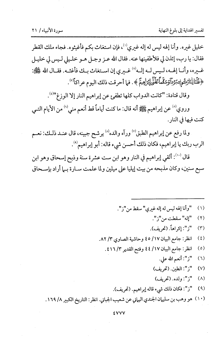 خليل غيره. وأنا إلهه ليس له إله غيري، فإن استغاث بكم فأغيثوه. فجاء ملك القطر فقال: يا رب، إئذن لي فلأطفينها عنه. فقال الله D هو خليل ليس لي خليل غيره، وأنا إلهه، ليس له إله غيري إن استغاث بك فأغثه. فقال الله D: { قُلْنَا يانار كُونِي بَرْداً وسلاما على إِبْرَاهِيمَ}. فما أحرقت ذلك اليوم عراكاً.