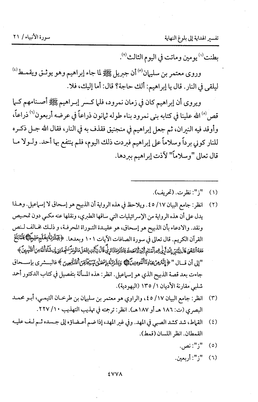 ويروى أن إبراهيم كان في زمان نمرود، فملا كسر إبراهيم A أصنامهم كما قص الله علينا في كتابه بنى نمروج بناء طوله ثمانون ذراعاً في عرضه أربعون ذراعاً، وأقد فيه النيران، ثم جعل إبراهيم في منجنيق فقذف به في النار، فقال الله جل ذكره للنار كوني برداً وسلاماً على إبراهيم فبردت ذلك اليوم، فلم ينتفع به أحد. ولولا ما قال تعالى: " وسلاماً " لآذت إبراهيم ببردها.