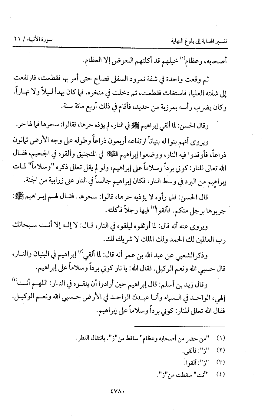 وقال زيد بن أسلم: قال إبراهيم حين أرادوا أن يلقوه في النار: اللهم أنت إلهي، الواحد في السماء وأناع عبدك الواحد في الأرض حسبي الله ونعم الوكيل. فقال الله تعالى للنار: كوني برداً وسلاماً على إبراهيم.