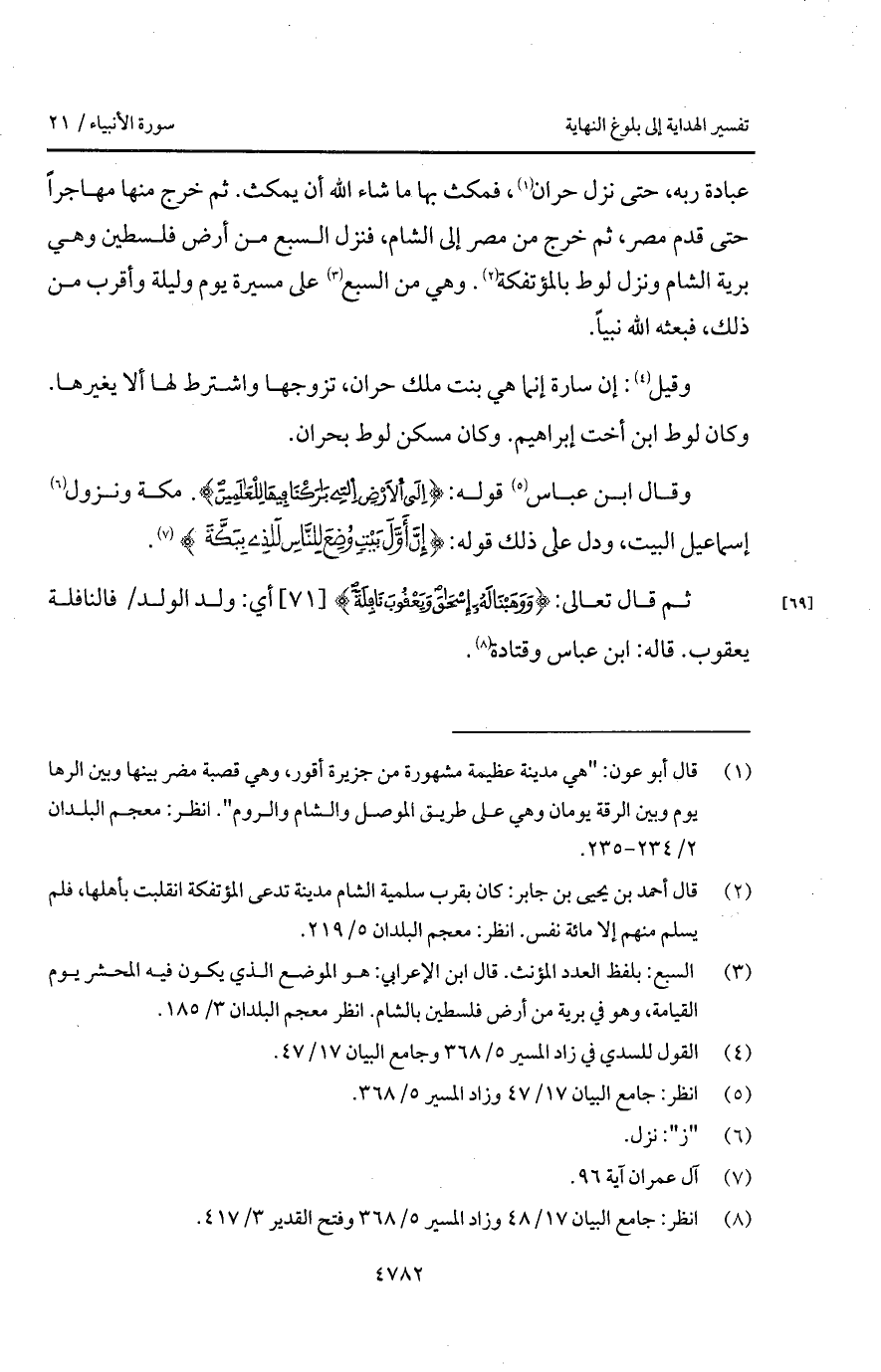 عبادة ربه، حتى نزل حران، فمكث بها ما ش اء الله أن يمكث. ثم خرج منها مهاجراً حتى قدم مصر، ثم خرج من مصر إلى الشام، فنزل السبع من أرض فلسطين وهي برية الشام ونزل لوط بالمؤتفكة. وهي من السبع على مسيرة يوم وليلة وأقرب من ذلك، فبعث الله نبياً.