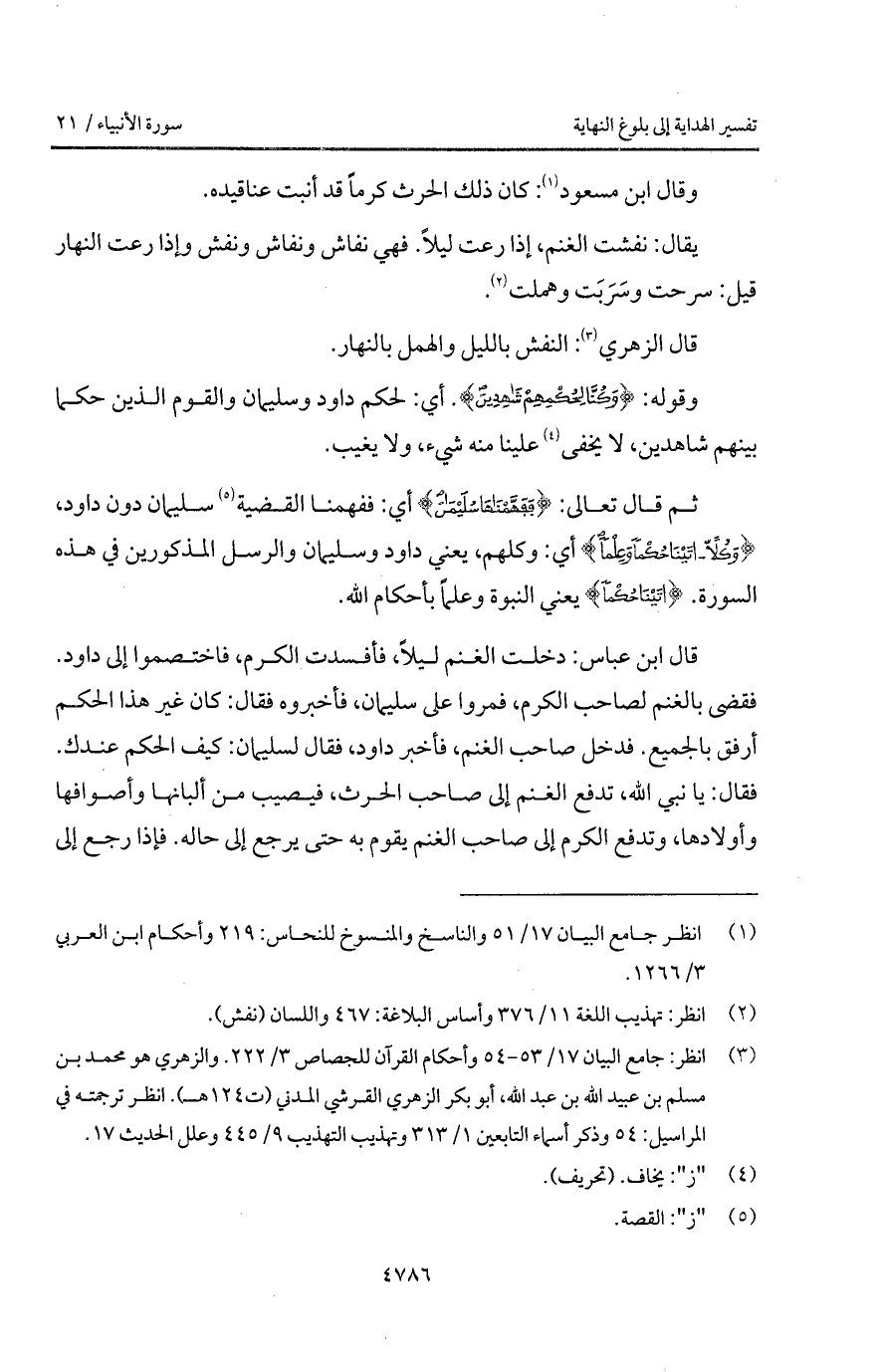 قال ابن عباس: دخلت الغنم ليلاً، فأفسدت الكرم، فاختصموا إلى داود. فقضى بالغنم لصاحب الكرم، فمروا على سليمان، فأخبروه فقال: كان غير هذا الحكم أرفق بالجميع. فدخل صاحب الغنم، فأخبر داود، فقال لسليمان: كيف الحكم عندك. فقال: يا نبي الله، تدفع الغنم إلى صاحب الحرث، فيصيب من ألبانها وأصوافها وأولادها، وتدفع الكرم إلى صاحب الغنم يقوم به حتى يرجع إلى حاله.