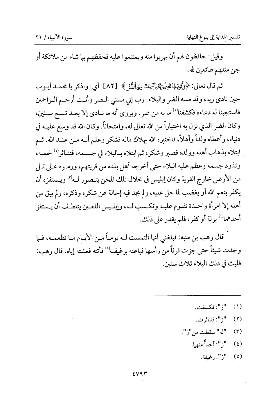 رب إني مسني الضر وأنت أرحم الراحمين فاستجبنا له دعاءه فكشفنا ما به من ضر. ويروى أنه ما نادى إلا بعد تسع سنين، وكان الضر الذي نزل به اختباراً من الله تعالى له، وامتحاناً. وكان الله قد وصع عليه في دنياه، وأعطاه ولداً وأهلاً، فاختبره الله بهلاك ماله فشكر وعلم أنه من عند الله. ثم ابتلاه بذهاب أهل وولده فصبر وشكر، ثم ابتلاه بالبلاء في جسمه، فتناثر لحمه، وتذود جسمه وعظم عليه البلاء حتى أخرجه أهل بلده من قريتهم، ورموه على تل من الأرض خارج القرية وكان إبليس في خلال تلك المحن يتصور له ويستفزه أن يكفر بنعم الله أو بغضم لما حل عليه، ولم يجد فيه إحالة عن شكره وذكره، ولم يبق من أهله إلا امرأة واحدة تقوم عليه وتكسب له، وإبليس اللعين يتلطف أن يستفز أحدهما بزلة أو كفر، فلم يقدر على ذلك.