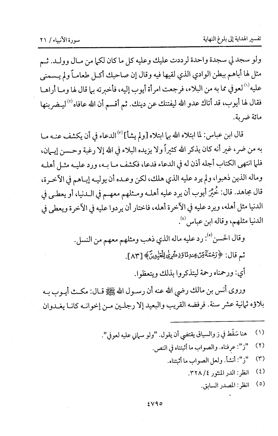 قال ابن عباس: لما ابتلاه الله بما ابتلاه [ولم يشأ] الدعاء في أن يكشف عنه ما به من ضر، غير أنه كان يذكر الله كثيراً ولا يزيده البلاء في الله إلا رغبة وحسن إيمان، فلما انتهى الكتاب أجله أذن له في الدعاء فدعا، فكشف ما به، ورد عليه مثل أهله وماله الذين ذهبوا، ولم يرج عليه الذي هلك، لكن وعده أن يوليه إياهم في الآخرة، قال مجاهد. قال: خُيِّرَ أيوب أن يرد عليه أهله ومثلهم معهم في الدنيا، أو يعطى في الدنيا مثل أهل، ويرد عليه في الآخرة أهله، فاختار أن يردوا عليه في الآخرة ويعطى في الدنيا مثلهم، وقال ابن عباس.