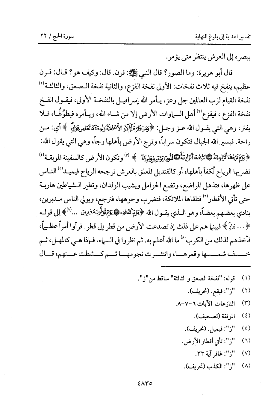قال أبو هريرة: وما الصور؟ قال النبي A: قرن. قال: وكيف هو؟ قال: قرن عظيم، ينفخ فيه ثلاث نفخات: الأولى نفخة الفزع، والثانية نفخة الصعق، والثالثة نفخة القيام لرب العالمين جل وعز، يأمر الله إسرافيل بالنفخة الأولى، فيقول انفخ نفخة الفزع، فيفزع أهل السماوات والأرض إلا من شاء الله، ويأمره فيطوِّلُها، فلا يفتر، وهي التي يقول الله D: { وَمَا يَنظُرُ هؤلاء إِلاَّ صَيْحَةً واحِدَةً مَّا لَهَا مِن فَوَاقٍ} أي: من راحة. فيسير الله الجبال فتكون سراباً، وترج الأرض بأهلها رجاً، وهي التي يقول الله: {يَوْمَ تَرْجُفُ الراجفة * تَتْبَعُهَا الرادفة * قُلُوبٌ يَوْمَئِذٍ وَاجِفَةٌ} وتكون الأرض كالسفينة الموبقة تضربها الرياح تُكفأ بأهلها، أو كالقنديل المعلق بالعرش ترجحه الرياح فيميد الناس على ظهرها، فتذهل المراضع، وتضع الحوامل ويشيب الولدان، وتطير الشياطين هاربة حتى تأتي الأقطار فتلقاها الملائكة، فتضرب وجوهها، فترجع، ويولي الناس مدبرين، ينادي بعضهم بضعاً، وهو الذي يقول الله {يَوْمَ التناد * يَوْمَ تُوَلُّونَ مُدْبِرِينَ. . .} إلى قوله {. . . هَادٍ} فبينما هم على ذلك إذ تصدعت الأرض من قطر إلى قطر. فرأوا أمراً عظيماً، فأخذهم لذلك من الكرب ما الله أعلم به. ثم نظرو في السماء، فإذا هي كالمهل، ثم خسف شمسها وقمرها، وانتثرت نجومها ثم كشطت عنهم، قال