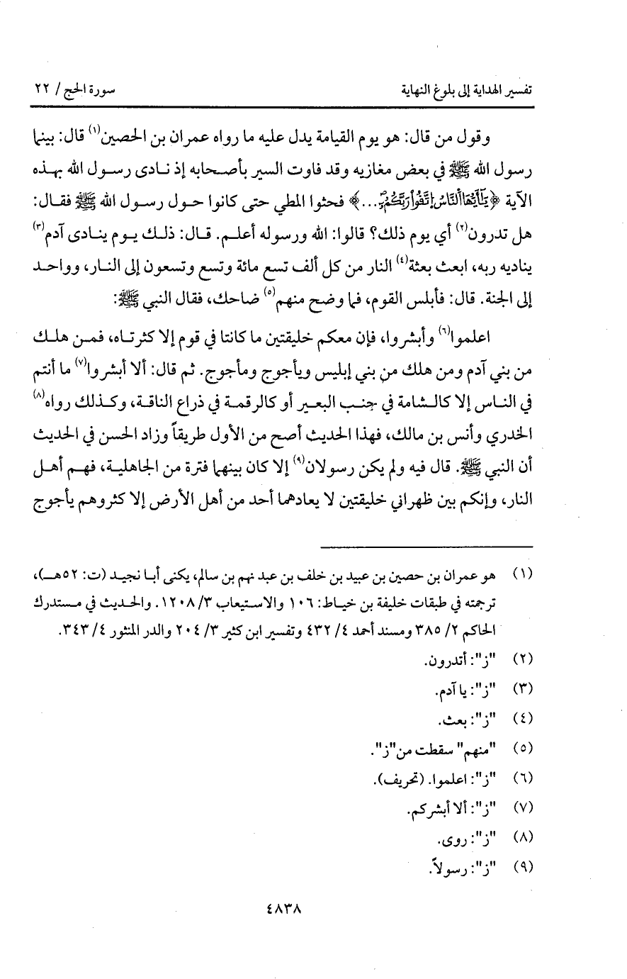 اعلموا وأبشروا، فإن معكم خليقتين ما كنتا في قوم إلا كثرتاه، فمن هلك من بني آدم ومن هلك من بني إسرائيل ويأجوج ومأجوج. ثم قال: ألا أبشروا ما أنتم في الناس إلا كالشامة في جنب البعير أو كالرقمة في ذراع الناقة "، وكذلك رواه الخدري وأنس بن مالك، فهذا الحديث أصح من الأول طريقاً وزاد الحسن في الحديث أن النبي A. قال فيه ولم يكن رسولان إلا كان بينهما فترة من الجاهلية، فهم أهل النار، وإنكم بين ظهراني خليقتين لا يعدهما أحد من أهل الأرض إلا كثروهم يأجوج