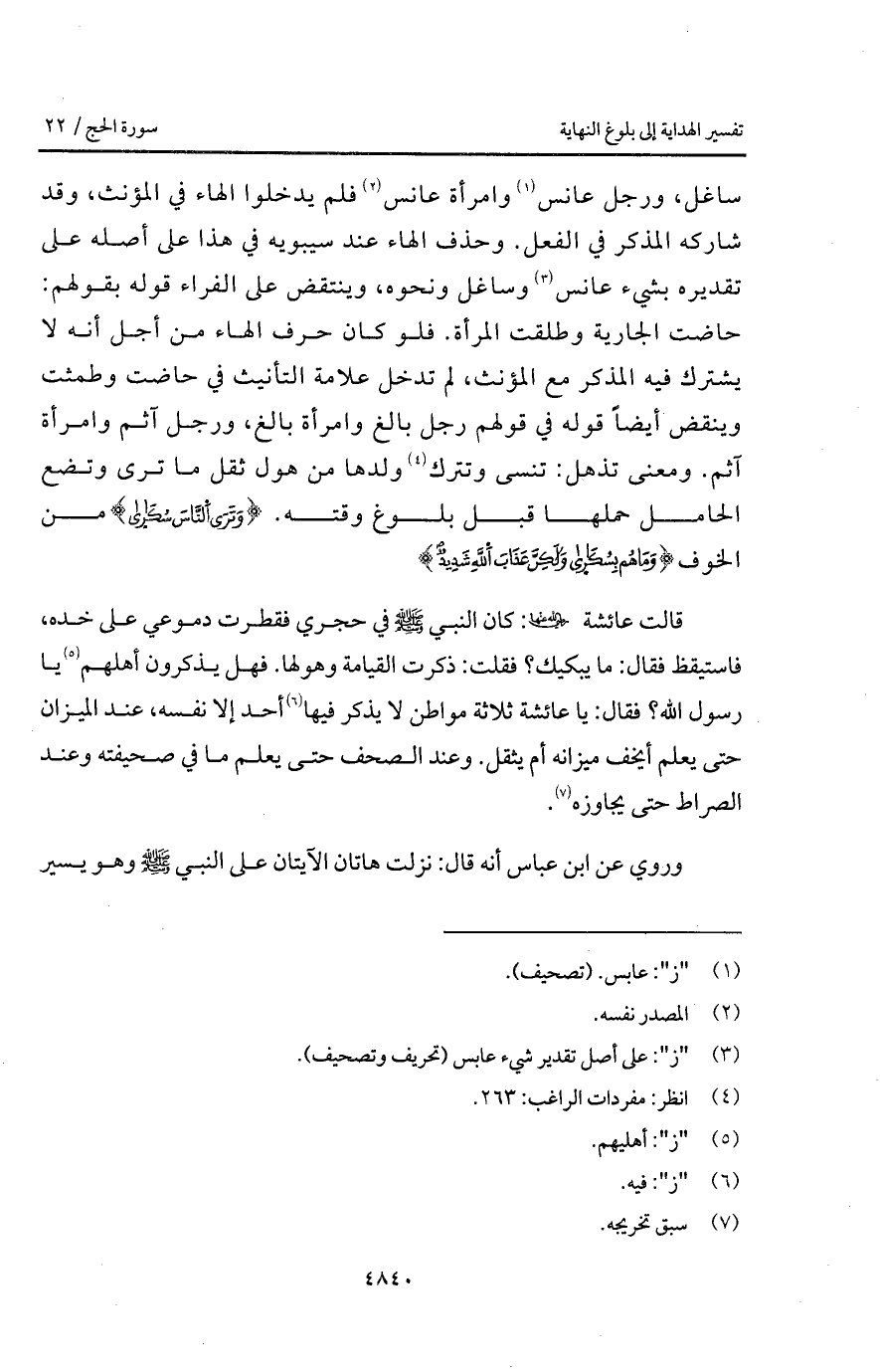 ساغل، ورجل عانس وامرأة عانٍ فلم يدخلوا الهاء في المؤنث، وقد شاركه المذكر في الفعل. وحذف الهاء عند سيبويه في هذا على أصله على تقديره بشيء عانس وساغل ونحوه، وينتقض على الفراء قوله بقولهم: حاضت الجارية وطلقت المرأة. فلو كان حرف الهاء من أجل أنه لا يشترك فيه المذكر مع المؤنث، ولم تدخل علامة التأنيث في حاضت وطمثت وينقض أيضاً قوله في قولهم رجل بالغ وامرأة بالغ، ورجل آثم وامرأة آثم. ومعنى تذهل: تنسى وتترك ولدها من هول ثقل ما ترى وتضع الحامل حملها قبل بلوغ وقته. {وَتَرَى الناس سكارى} من الخوف {وَمَا هُم بسكارى ولكن عَذَابَ الله شَدِيدٌ}.