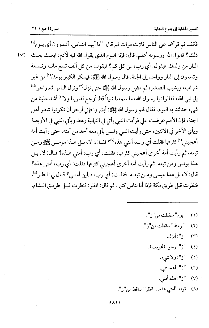 فكف ثم قرأهما على الناس ثلاثة مرات ثم قال: " يا أيها الناس، أتدرون أي يوم ذلك؟ قالوا: الله ورسوله أعلم. قال: فإنه اليوم الذي يقول الله فيه لآدم: ابعث بعث النار من ولدك. فيقول: أي رب، من كل كم؟ فيقول؟ من كل ألف تسع مائة وتسعة وتسعون إلى النار وواحد إلى الجنة. قال رسول الله A: فيسكر الكبير يومئذ من غير شراب، ويشيب الصغير، ثم مضى رسول الله A حتى نزل ونزل الناس ثم راحوا إلى نبي الله، فقالوا: يا رسول الله، ما سمعنا شيئاً قط أوجع لقلوبنا ولا أشد علينا من شيء حدثتنا به اليوم. فقال لهم رسول الله A: أبشروا فإني أرجو أن تكونوا شطر أهل الجنة، فإن الأمم عرضت علي فرأيت النبي يأتي في الثمانية ورهطب ويأتي النبي في الأربعة وياتي الآخر في الاثنين، حتى رأتي النبي وليس يأتي معه أحد من أمته، حتى رأيت أمة أعجبني كثرتها لقلت أي رب، أمتي هذه؟ فقال: لا، بل هذا موسى A ومن تبعه، ثم رأيت أمة أخرى أعجبني كثرتها، فقلت: أي رب، أمتي هذه؟ قال: لا. بل هذا يونس ومن تبعه. ثم رأيت أمة أخرى أعجبني كثرتها فقلت: أي رب، أمتي هذه؟ قال: لا، بل هذه عيسى ومن تبعه. فقلت: أي رب، فأين أمتي؟ قال لي: انظر، فنظرت قبل طريق مطة فإذا أنا بناس كثير. ثم قال: انظر: فنظرت قبل طريق الشام،
