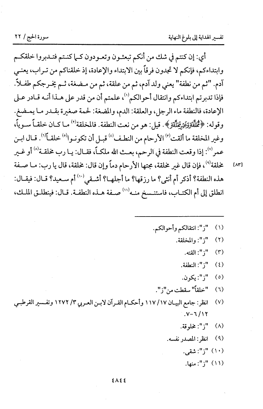 أي: إن كنتم في شك من أنكم تبعثون وتعودون كما كنتم فتدبروا خلقكم وابتداءكم، فإنكم لا تجدون فرقاً بين الابتداء والإعادة، إذ خلقناكم من تراب، يعني آدم. " ثم من نطفة " يعني ولد آدم، ثم من علقة، ثم من مضغة، ثم يخرجكم طفلاً. فإذا تدبرتم ابتداءكم وانتقال أحوالكم، علمتم أن من قدر على هذا أنه قادر على الإعادة، فالنطفة ماء الرجل، والعلقة: الدم، والمضغة: لحمة صغير بقدر ما يمضغ. وقوله: {مُّخَلَّقَةٍ وَغَيْرِ مُخَلَّقَةٍ}. قيل: هو من نعت النطفة. فالمخلقة ما كان خلقاً سوياً، وغير المخلقة ما ألقت الأرحام من النطف قبل أن تكونوا خلقاً. قال ابن عمر: إذا وقت النطفة في الرحم، بعث الله ملكاً، فقال: يا رب مخلقة أو غير مخلقة، فإن قال مخلقة، مجتها الأرحام دماً وإن قال: مخلقة، قال يا رب: ما صفة هذه النطفة؟ أذكر أم أنثى؟ ما رزقها؟ ما أجلها؟ أشقي أم سعيد؟ قال: فيقال: انطلق إلى أم الكتاب، فاستنسخ منه صفة هذه النطفة. قال: فينطلق الملك،
