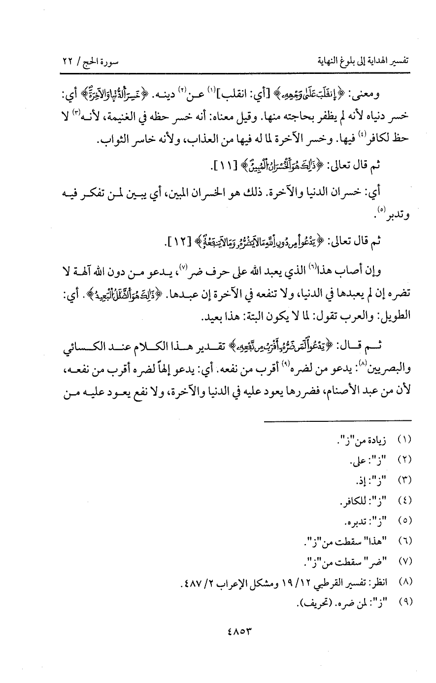 ومعنى: {انقلب على وَجْهِهِ} [أي: انقلب] عن دينه. {خَسِرَ الدنيا والآخرة} أي: خسر دنياه لأنه لم يظفر بحاجته منها. وقيل م عناه: أنه خسر حظه في الغنيمة، لأنه لا حظ لكافر فيها. وخسر الآخرة لما له فيها من العذاب، ولأنه خاسر الثواب.