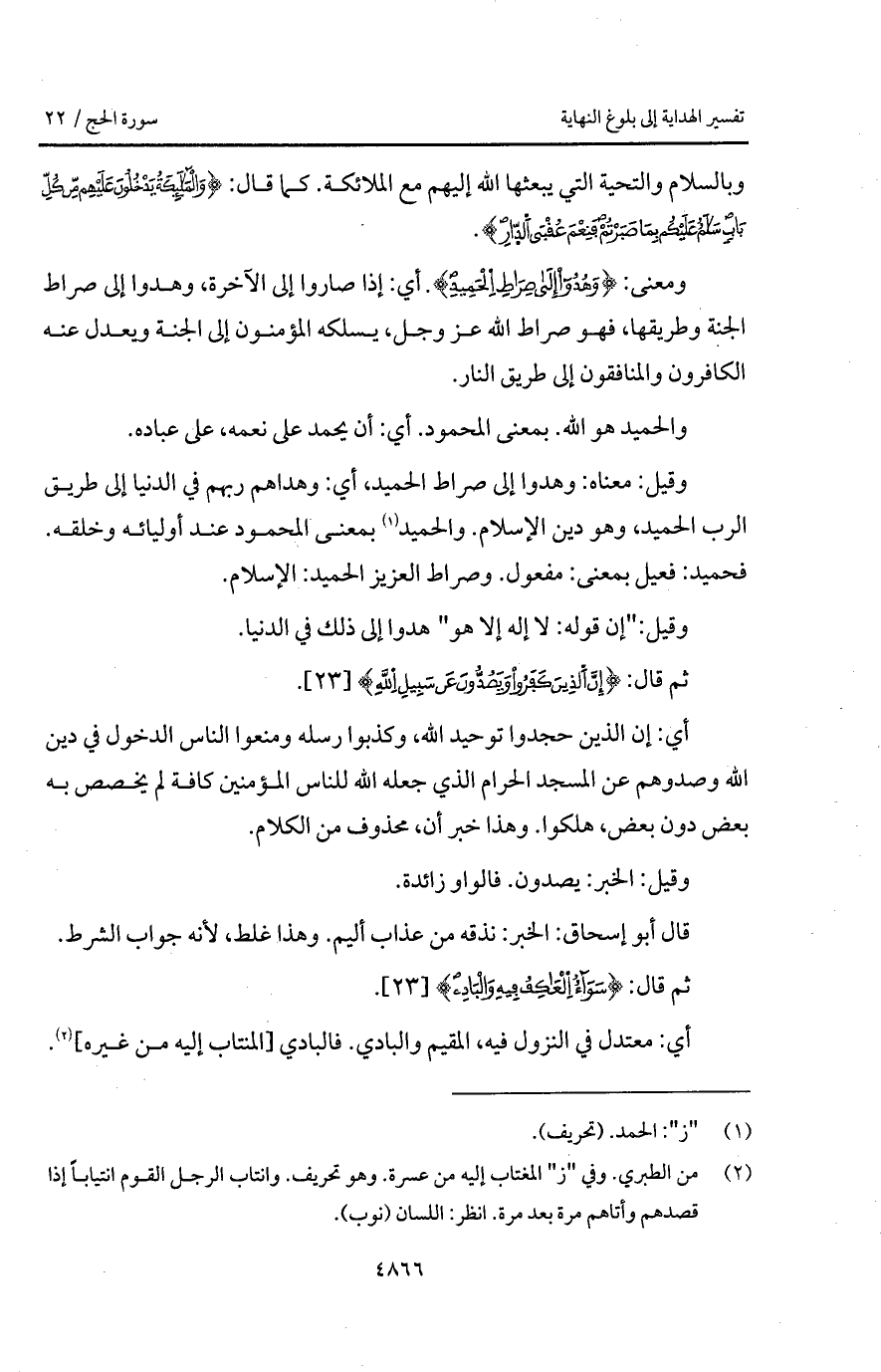 ومعنى: {وهدوا إلى صِرَاطِ الحميد}. أي: إذا صاروا إلى الآخرة، وهدروا إلى صراط الجنة، وطريقها، فهو صراط الله D، يسلكه المؤمنون إلى الجنة ويعدل عنه الكافرون والمنافقون إلى طريق النار.