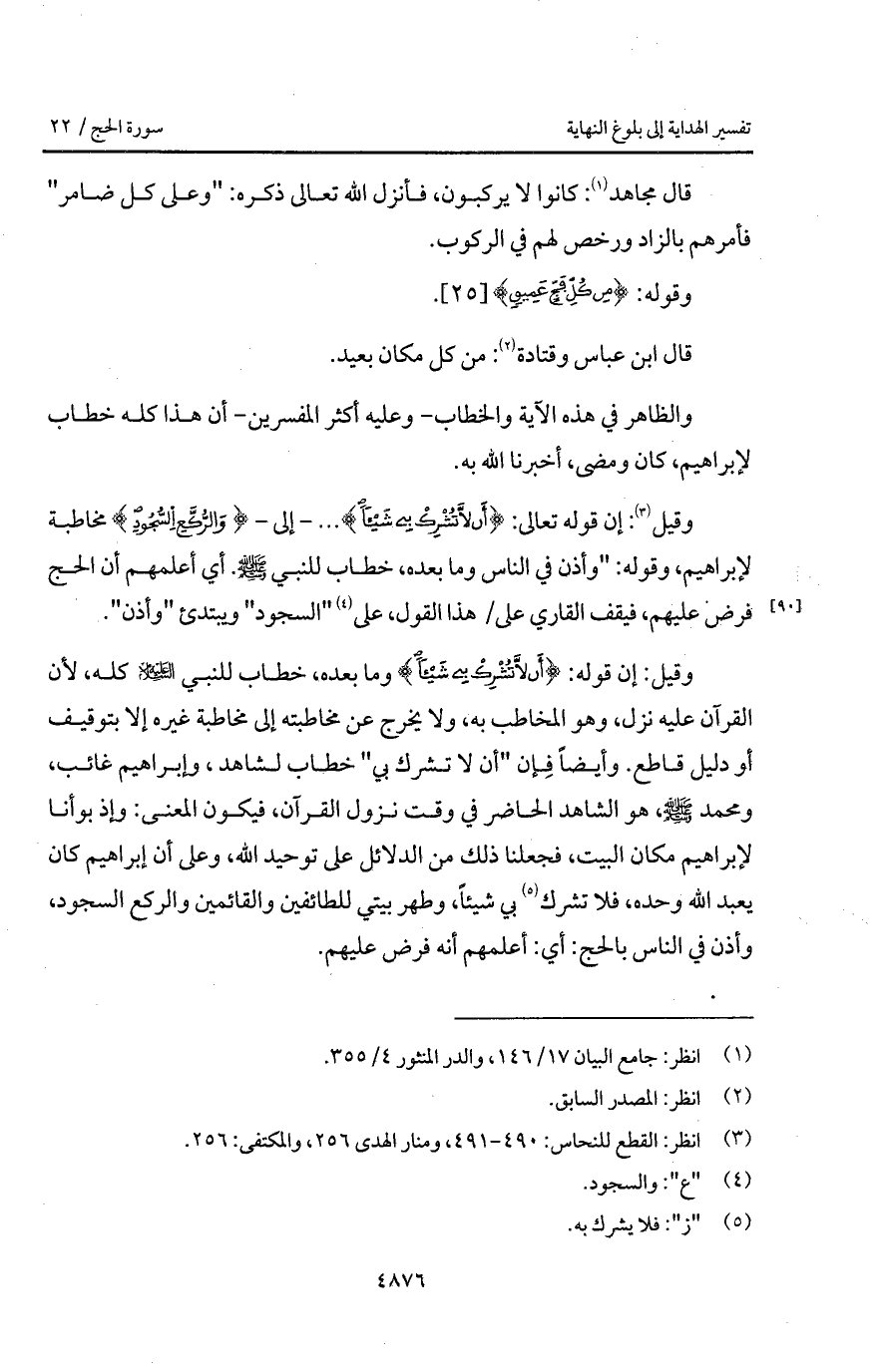 وقيل: إن قوله تعالى: {أَن لاَّ تُشْرِكْ بِي شَيْئاً}. . . - إلى - {والركع السجود} مخاطبة لإبراهيم، وقوله: " وأذن في الناس وما بعده، خطاب للنبي A أي أعلمهم أن الحج فرض عليه، فيقف القاري على/ هذا القول، على " السجود " ويبتدئ " وأذن ".