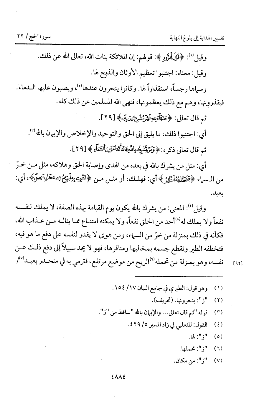 وقيل: المعنى: من يشرك بالله يكون يوم القيامة بهذه الصفة، لا يملك لنفسه نفعاً ولا يملك له أحد من الخلق نفعاً، ولا يمكنه امتناع مما يناله من عذاب الله، فكأنه في ذلك بمنزلة من خرّ من السماء، ومن هوى لا يقدر لنفسه على دفع ما هو فيه، فتخطفه الطير وتقطع جسمه بمخالبها ومناقرها، فهلاو لا يجد سبيلاً إلى دفع ذلك عن نفسه، وهو بمنزلة من تحمله الريح من موضع مرتفع، فترمي به في منحدر بعيد/