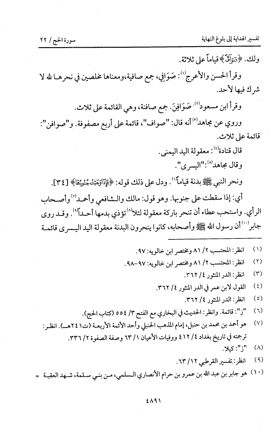 وروي عن مجاهد أنه قال: " صواف "، قائمة على أربع مصفوفة. و " صوافن ": قائمة على ثلاث.