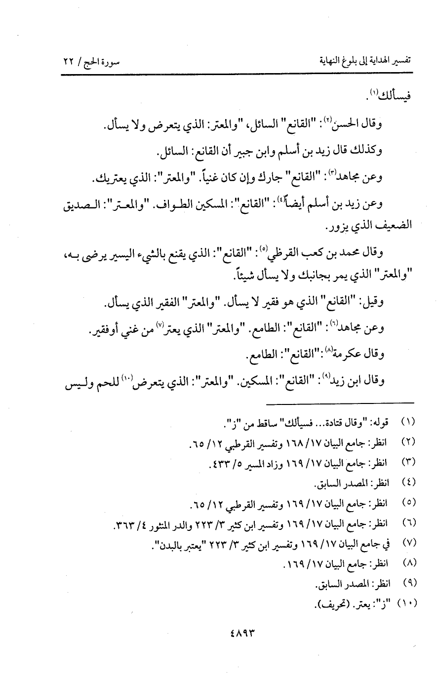 وعن زيد بن أسلم أيضاً: القانع ": المسكين الطواف. " والمعتر ": الصديق الضعيف الذي يزور.