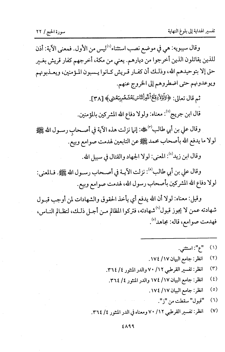 وقال علي بن أبي طالب: نزلت الآية في أصحاب رسول الله A. فالمعنى: لولا دفاع الله المشركين بأصحاب رسول الله، لهدمت صوامع وبيع.