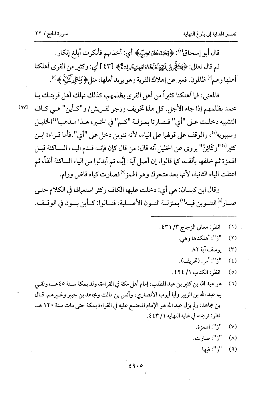 فالمعنى: فما أهلكنا كثيراً من أهل القرى بظلمهم، كذلك نهلك أهل قريتك يا محمد بظلمهم إذا جاء الأجل. كل هذا تخويف وزجر لقريش/ و " كأين " هي كاف التشبيه دخلت على " أي " فصارتا بمنزلة " كم " في الخبر، هذا مذهب الخليل وسيبويه، والوقف على قولهما على الياء، لأنه تنوين دخل على " أي " فأما قراءة ابن كثير وكَائِنْ " يروى عن الخليل أنه قال: من قال كإن فإنه قدم الياء الساكنة قبل الهمزة ثم خلفها بألف، كما قالوا:، إن أصل آية: إيَّة، ثم أبدلوا من الياء الساكنة ألفاً، ثم اعتلت الياء الثانية، لأنها بعد متحرك وهو الهمز فصارت كياء قاض وارم.