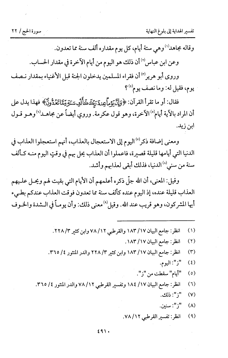 وقل: المعنى: أن الله جلّ ذكره أعلمهم أن الأيام التي بقيت لهم ويحل عليهم العذاب قليلة عنده، إذ اليوم عنده كألف سنة مما تعدون فوقت العذاب عندكم بطيء أيها المشركون، وهو قريب عند الله. وقيل معنى ذلك: وأن يوماً في الشدة والخوف