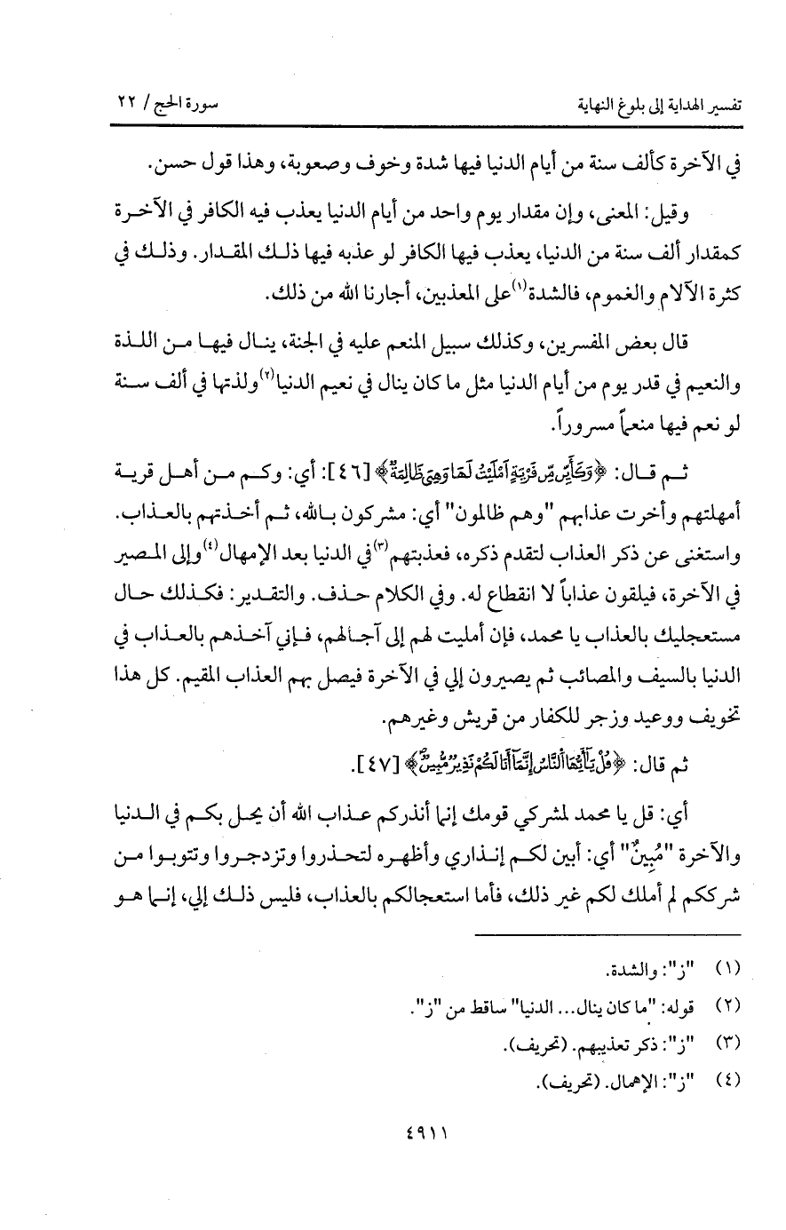 ثم قال: {وَكَأَيِّن مِّن قَرْيَةٍ أَمْلَيْتُ لَهَا وَهِيَ ظَالِمَةٌ}: أي: وكم من أهل قرية أمهلتهم وأخرت عذابهم " وهم ظالمون " أي: مشركون بالله، ثم أخذتهم بالعذاب. واستغنى عن ذكر العذاب لتقدم ذكره، فعذبتهم في الدنيا بعد الإمهال وإلى المصير في الآخرة، فليقون عذاباً لا انقطاع له. وفي الكلام حذف. والتقدير: فكذلك حال متسعجليك بالعذاب يا محمد، فإن أمليت لهم إلى آجالهم، فإني آخذهم بالعذاب في الدنيا بالسيف والمصائب ثم يصيرون إلي في الآخرة فيصل بهم العذاب المقيم. كل هذا تخويف ووعيد وزجر للكفار من قريش وغيرهم.
