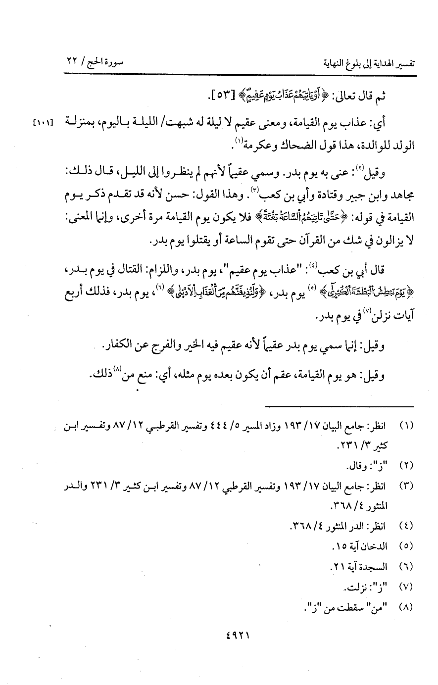 وقيل: عنى به يوم بدر. وسمي عقيماً لأنهم لم ينظروا إلى الليل، قال ذلك: مجاهد وابن جبير وقتادة وأبي بن كعب. وهذا القول: حسن لأنه قد تقدم ذكر يوم القيامة في قوله: {حتى تَأْتِيَهُمُ الساعة بَغْتَةً} فلا يكون يوم القيامة مرة آخرى، وإنما المعنى: لا يزالون في شك من القرآن حتى تقوم الساعة أو يقتلوا يوم بدر.