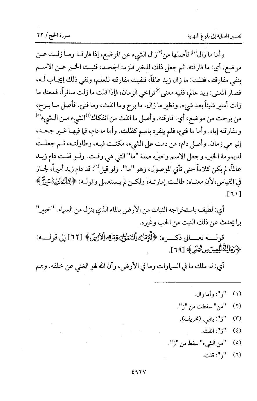 وأما ما زال فأصلها من زال الشيء عن الموضع، إذا فارقه وما زلت عن موضع، أي: ما فارقته. ثم جعل ذلك للخبر فلزمه الجحد، فثبت الخبر عن الاسم بنفي مفارقته، فقلت: ما زال زيد عالماً، فنيت مفارقته للعلم، ونفي ذلك إيجاب له، فصار المعنى: زيد علام، ففيه معنى تراخي الزمان، فإذا قلت ما زلت سائراً، فمعناه ما زلت أسير شيئاً بعد شيء. ونظير ما زال، ما برح وما انفك، وما فتئ. فأصل ما برح، من برحت من موضع، أي: فارقته. وأصل ما انفك من انفكاك الشيء من الشيء ومفارقته إياه. وأما ما فتئ، فلم ينفرد باسم كظلت. وأما ما دام، فما فيها غير جحد، إنما هي زمان. وأصل دام، من دمت على الشيء، مكثت فيه، وطاولته، ثم جعلت لديمومة الخبر، وجعل الاسم وخبره صلة " ما " التي هي وقت. ولو قلت دام زيد عالماً، لم يكن كلاماً حتى تأتي الموصول، وهو " ما ". ولو قيل: قد دام زيد أميراً، لجاز في القياس، لأن معناه: طالت إمارته، ولكن لم يستعمل وقوله: {إِنَّ الله لَطِيفٌ خَبِيرٌ}.