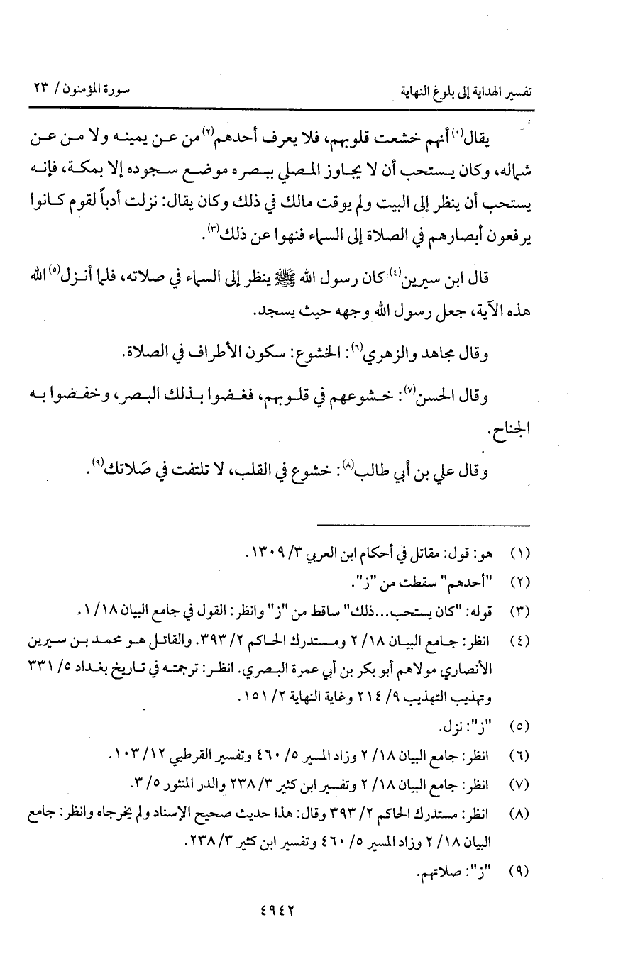 قال ابن سيرين كان رسول الله A ينظر إلى السماء في صلاته، فلما أنزل الله هذه الآية، جعل رسول الله وجهه حيث يسجد.