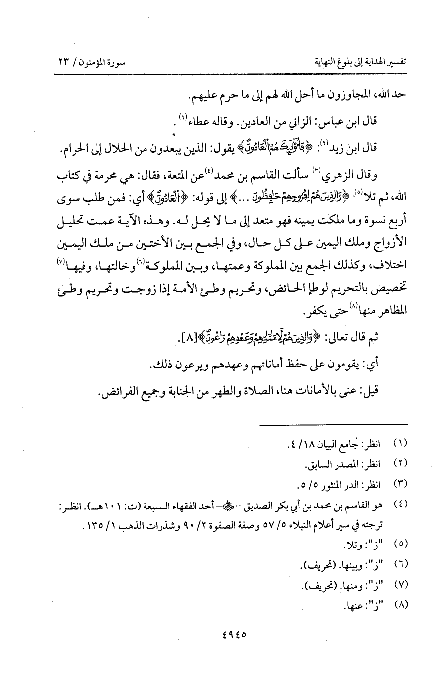 وقال الزهري سألت القاسم بن محمد عن المتعة، فقال: هي محرمة في كتاب الله، ثم تلا. {والذين هُمْ لِفُرُوجِهِمْ حَافِظُونَ. . .} إلى قوله: {العادون} أي: فمن طلب سوى أربع نسوة وما ملكت يمينه فهو متعد إلى ما لا يحل له. وهذه الآية عمت تحليل الأزواج وملك اليمين على كل حال، وفي الجمع بين الأختين من ملك اليمين اختلاف، وكذلك الجمع بين المملوكة وعمتها، وبين المملوكة وخالتها، وفيها تخصيص بالتحريم لوطإ الحائض، وتحرم وطئ الأمة إذا زوجت وتحريم وطئ المظاهر منها حتى يكفر.