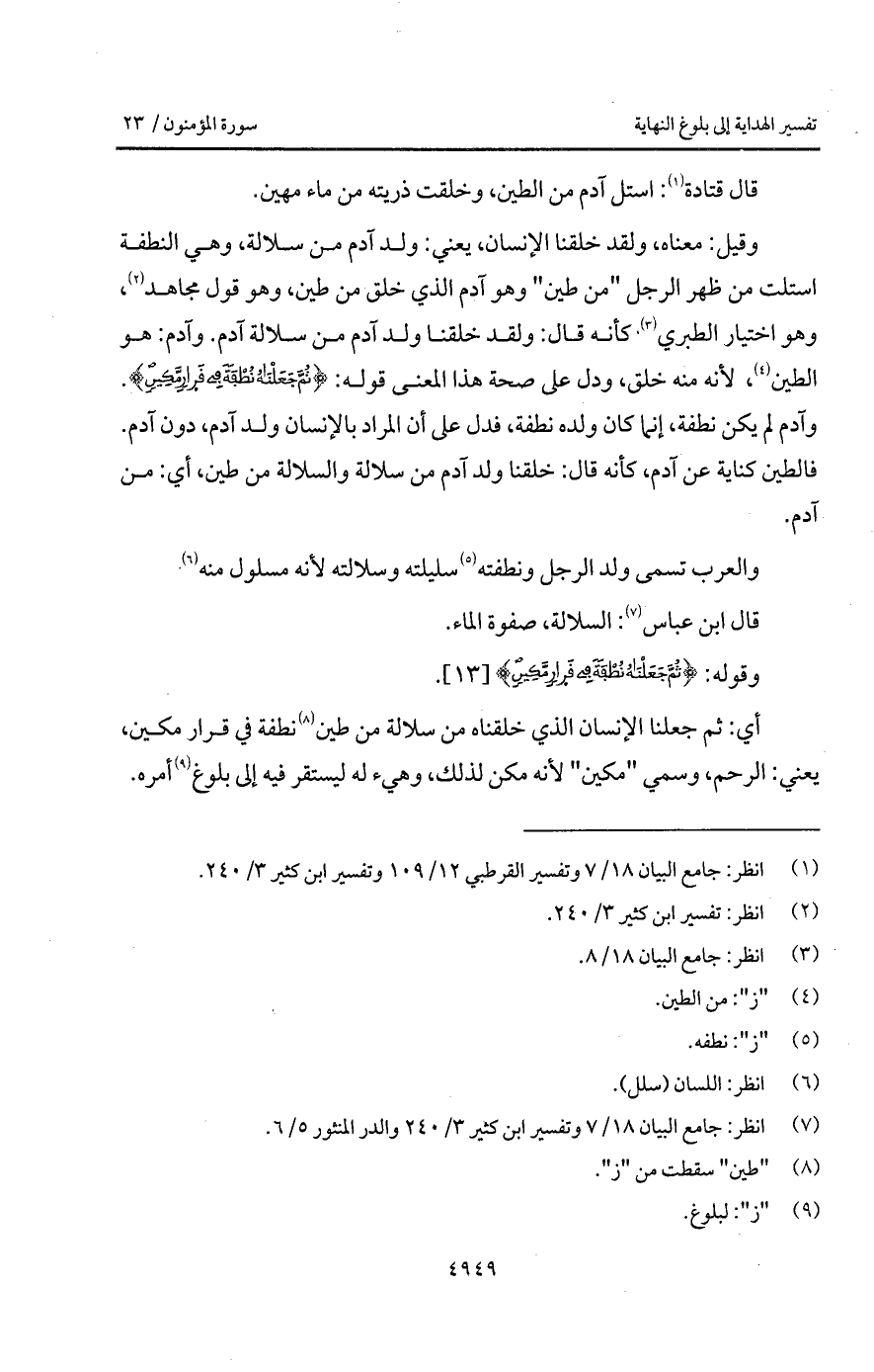 وقيل: معناه، ولقد خلقنا الإنسان، يعني: ولد آدم من سلالة، وهي النطفة استلت من ظهر الرجل " من طين " وهو آدم الذي خلق من طين، وهو قول مجاهد، وهو اختيار الطبري كأنه قال: ولقد خلقنا ولد آدم من سلالة آدم. وآدم: هو الطين، لأنه منه خلق، ودل على صحة هذا المعنى قوله: {ثُمَّ جَعَلْنَاهُ نُطْفَةً فِي قَرَارٍ مَّكِينٍ}. وآدم لم يكن نطفة، إنما كان ولده نطفة، فدل على أن المراد بالإنسان ولد آدم، دون آدم. فالطين كناية عن آدم، كأنه قال: خلقنا ولد آدم من سلالة والسلالة من طين، أي: من آدم.