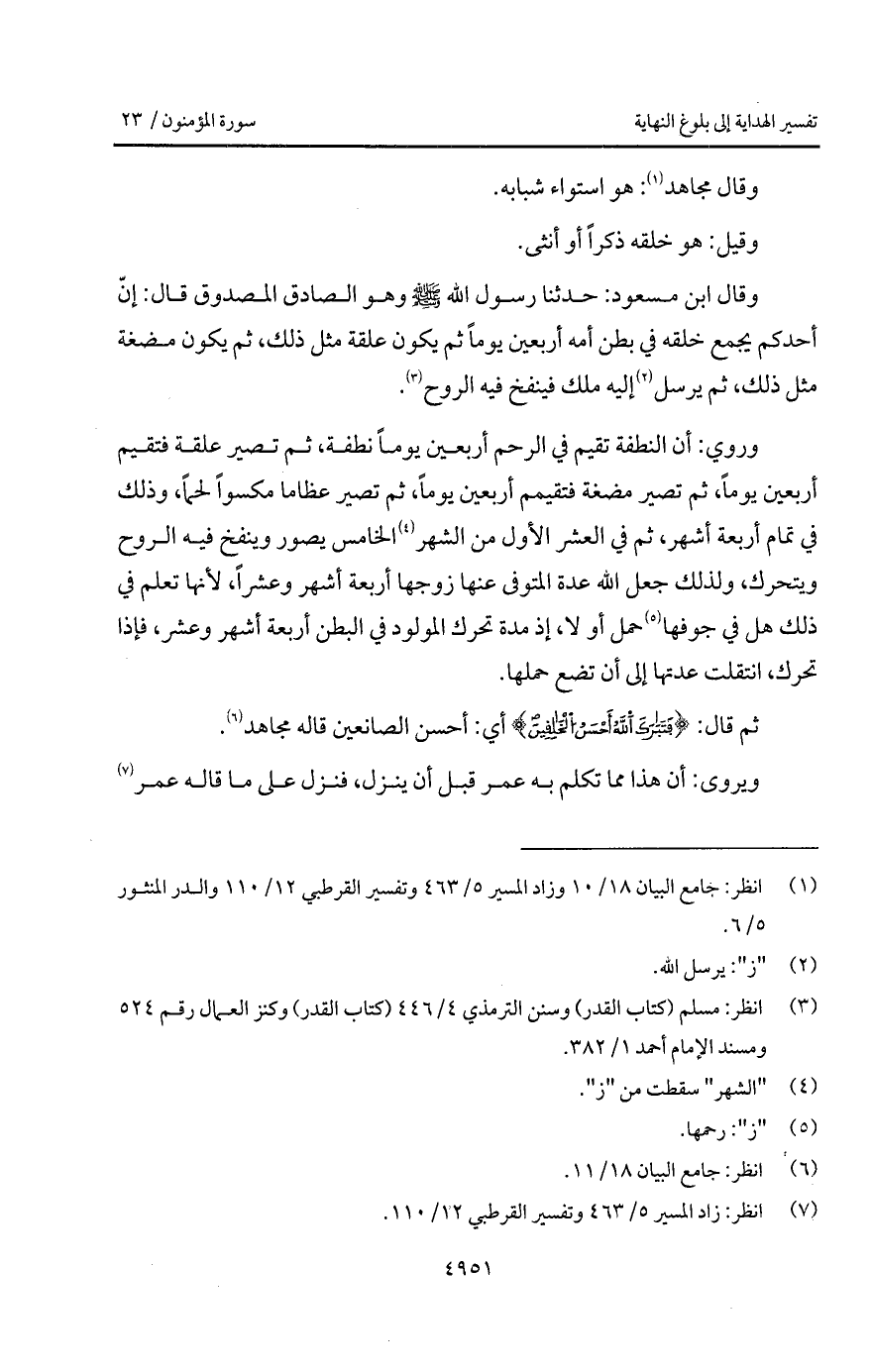 وقال ابن مسعود: حدثنا رسول الله A وهو الصادق المصدوق قال: " إنّ أحدكم يجمع خلقه في بطن أمه أربعين يوماً ثم يكون علقة مثل ذلك، ثم يكون مضغة مثل ذلك، ثم يرسل إليه ملك فينفخ فيه الروح ".