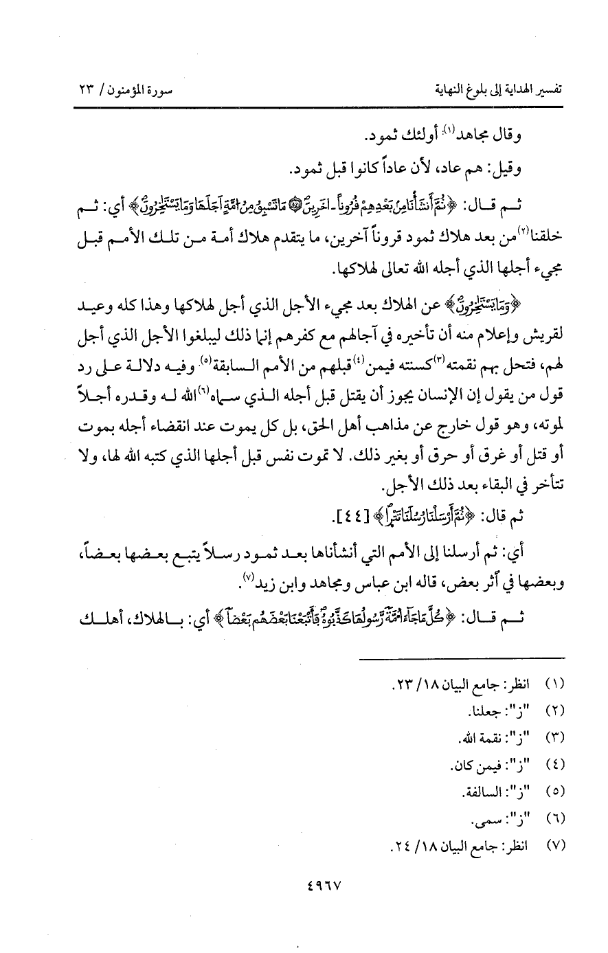ثم قال: {ثُمَّ أَنشَأْنَا مِن بَعْدِهِمْ قُرُوناً آخَرِينَ * مَا تَسْبِقُ مِنْ أُمَّةٍ أَجَلَهَا وَمَا يَسْتَأْخِرُونَ} أي: ثم خلقنا من بعد هلاك ثمود قروناً آخرين، ما يتقدم هلاك أمة من تلك الأمم قبل مجيء أجلها الذي أجله الله تعالى لهلاكها.