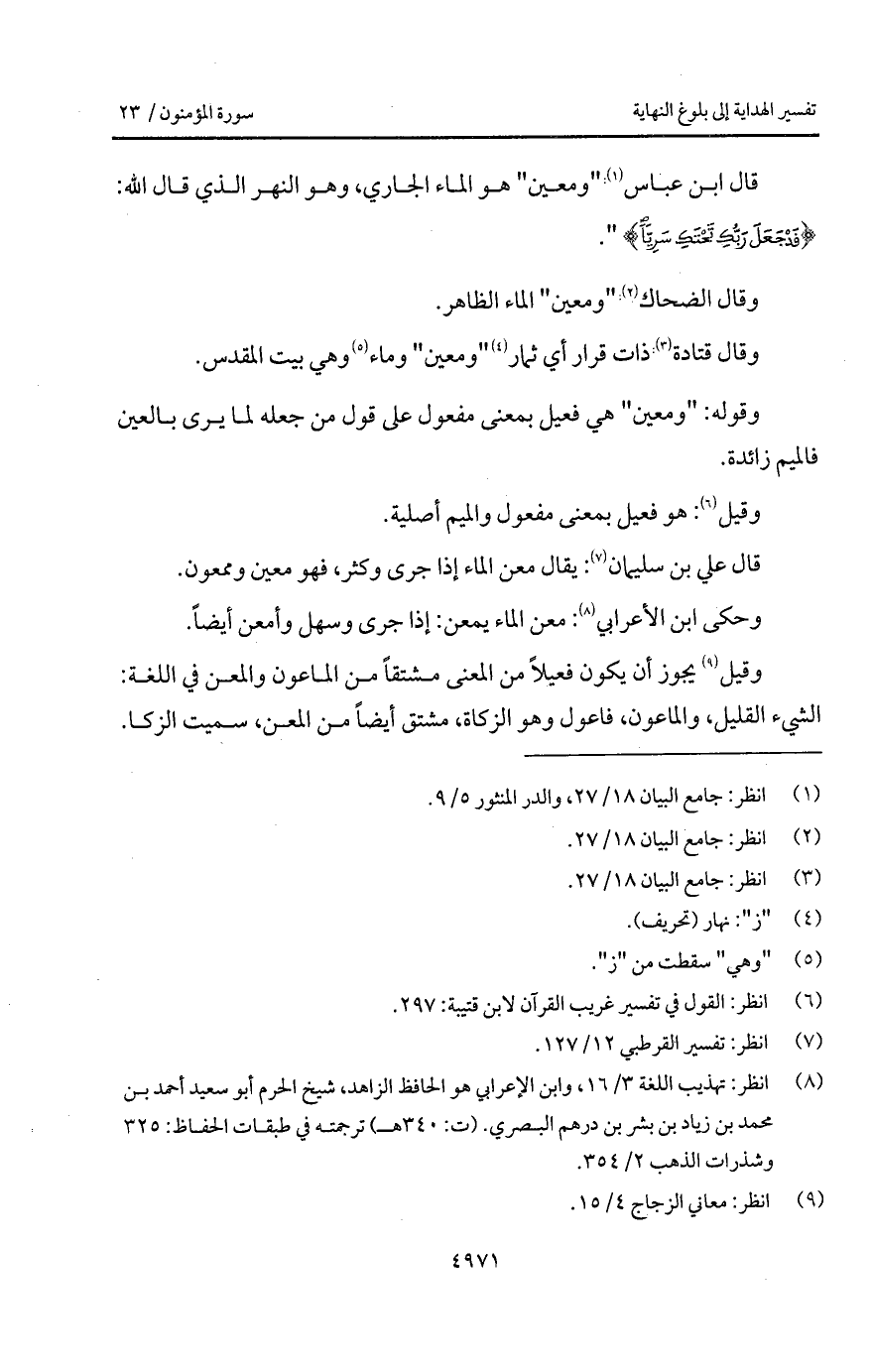 قال ابن عباس " ومعين " هو الماء الجاري، وهو النهر الذي قال الله: {قَدْ جَعَلَ رَبُّكِ تَحْتَكِ سَرِيّاً} ".