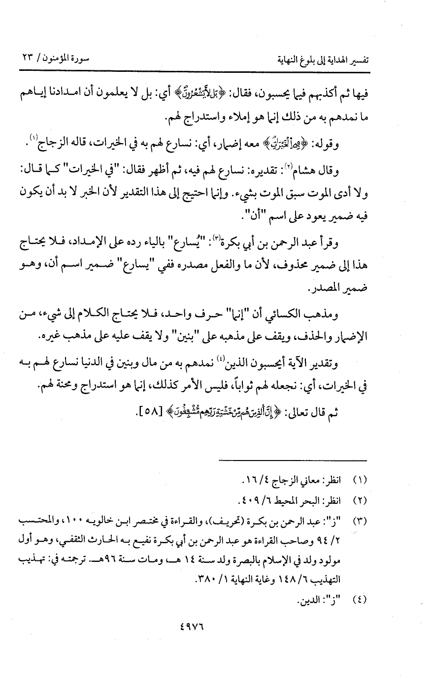 وقال هشام: تقديره: نسارع لهم فيه، ثم أطهر فقال: " في الخيرات " كما قال: ولا أدى الموت سبق الموت بشيء. وإنما احتيج إلى هذا التقدير لأن الخبر لا بد أن يكون فيه ضمير يعود على اسم " أن ".