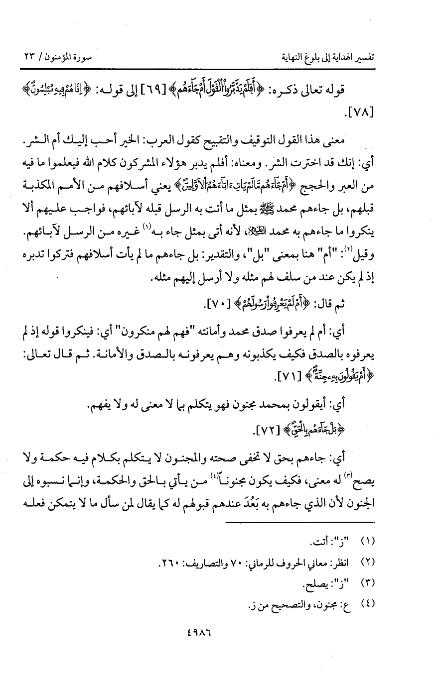 معنى هذا القول التوقيف والتقبيح كقول العرب: الخير أحب إليك أم الشر. أي: إنك قد اخترت الشر. ومعناه: أفلم يدبر هؤلاء المشركون كلام الله فيعلموا ما فيه من العبر والحجج {أَمْ جَآءَهُمْ مَّا لَمْ يَأْتِ آبَآءَهُمُ الأولين} يعني أسلافهم من الأمم المكذبة قبلهم، بل جاءهم محمد A بمثل ما أتت به الرسل قبله لآبائهم، فواجب عليهم ألا ينكروا ما جاءهم به محمد عليه السلام، لأنه أتى بمثل جاء به غيره من الرسل لآبائهم. وقيل: " أم " هنا بمعنى " بل "، والتقدير: بل جاءهم ما لم يأت أسلافهم فتركوا تكدبره إذ لم يكن عند من سلف لهم مثله ولا أرسل إليهم مثله.