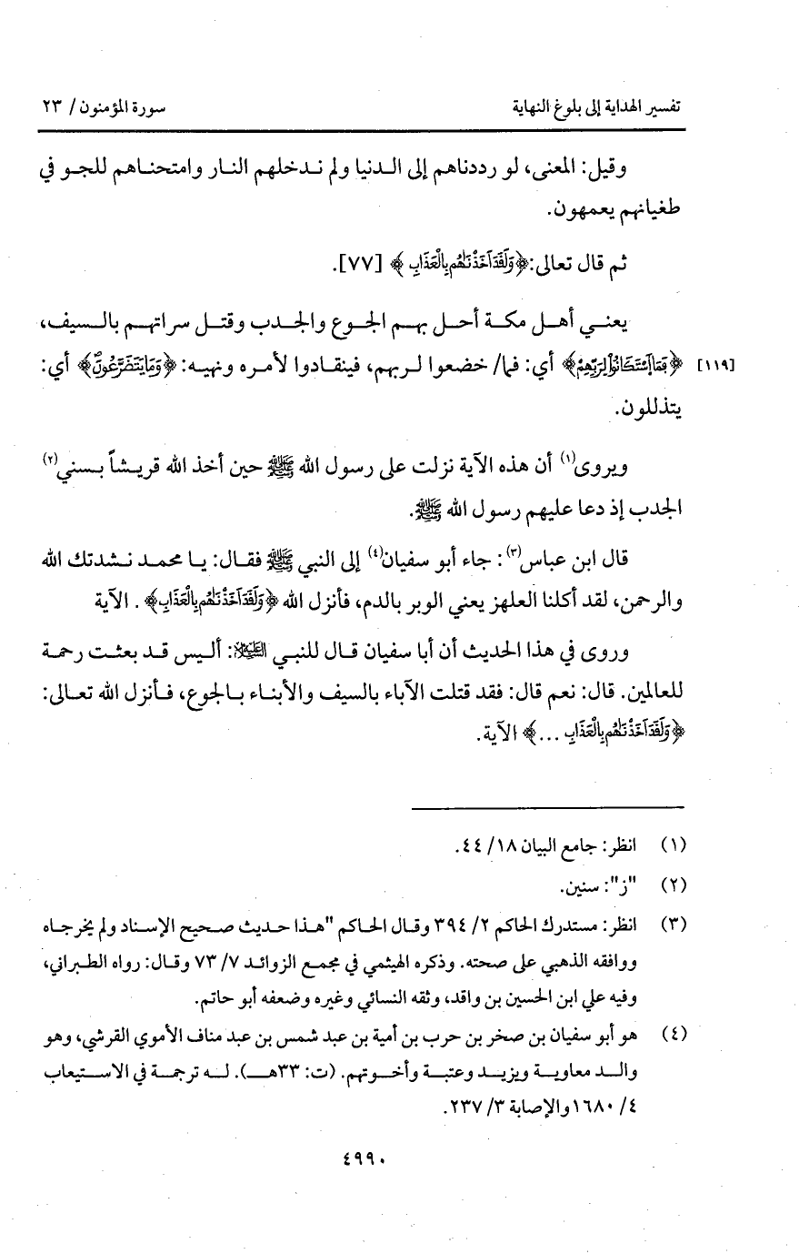 وروى في هذا الحديث " أن أبا سفيان قال للنبي عليه السلام: أليس قد بعثت رحمة للعالمين. قال: نعم قال: فقد قتلت الآباء بالسيف والأبناء بالجوع، فأنزل الله تعالى: {وَلَقَدْ أَخَذْنَاهُمْ بالعذاب. . .} الآية ".