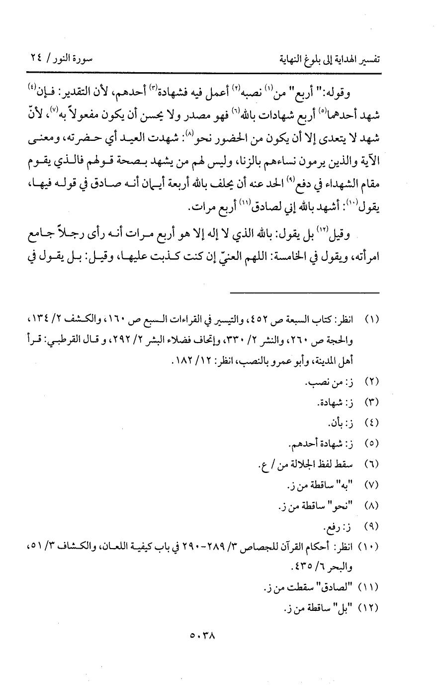 وقوله: " أربع " من نصبه أعمل فيه فشهادة أحدهم، لأن التقدير: فإن شهد أحدهما أربع شهادات بالله فهو مصدر ولا يحسن أن يكون مفعولاً به، لأنّ شهد لا يتعدى إلا أن يكون من الحضور نحو: شهدت العيد أي حضرته، ومعنى الآية والذين يرمون نساءهم بالزنا، وليس لهم من يشهد بصحة قولهم فالذي يقوم مقام الشهداء في دفع الحد عنه أن يحلف بالله أربعة أيمان أنه صادق في قوله فيها، يقول: أشهد بالله إني لصادق أربع مرات.
