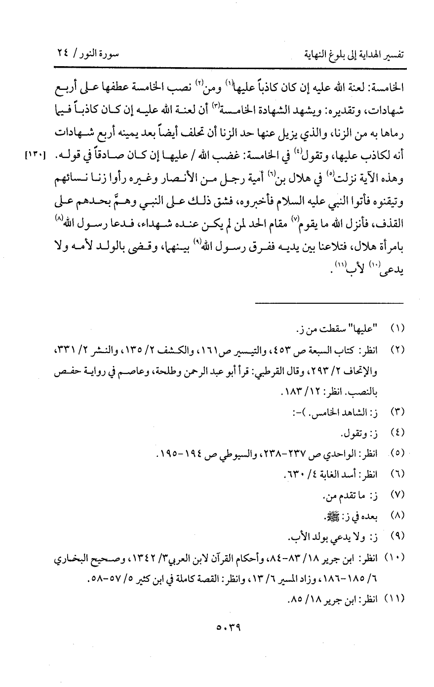 الخامسة: لعنة الله عليه إن كان كاذباً عليها ومن نصب الخامسة عطفها على أربع شهادات، وتقديره: ويشهد الشهادة الخامسة أن لعنة الله عليه إن كان كاذباً فيما رماها به من الزنا، والذي يزيل عنها حد الزنا أن تحلف أيضاً بعد يمينه أربع شهادات أنه لكاذب عليها، وتقول في الخامسة: غضب الله / عليها إن كان صادقاً في قوله. وهذه الآية نزلت في هلال بن أمية رجل من الأنصار وغيره رأوا زنا نسائهم وتيقنوه فأتوا النبي عليه السلام فأخبروه، فشق ذلك على النبي وهمَّ بحدهم على القذف، فأنزل الله ما يقوم مقام الحد لمن لم يكن عنده شهداء، فدعا رسول الله بامرأة هلال، فتلاعنا بين يديه ففرق رسول الله بينهما، وقضى بالولد لأمه ولا يدعى لأب.
