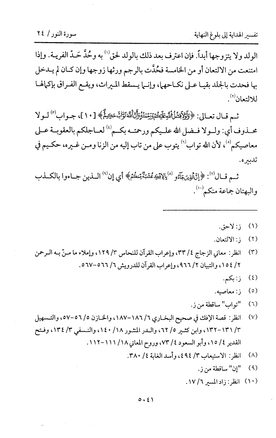 الولد ولا يتزوجها أبداً. فإن اعترف بعد ذلك بالولد لحق به وحُدَّ حَدّ الفرية. وإذا امتنعت من الالتعان أو من الخامسة فحُدَّت بالرجم ورثها زوجها وإن كان لم يدخل بها فحدت بالجلد بقيا على نكاحهما، وإنما يسقط الميراث، ويقع الفراق بإكمالها للالتعان.