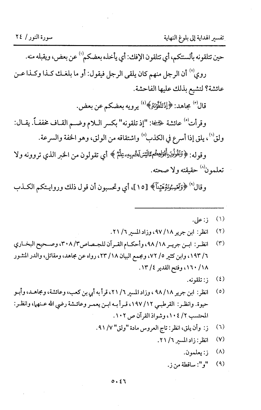 وقرأت عائشة Bها: " إذ تلقونه " بكسر اللام وضم القاف مخففاً. يقال: ولق، يلق إذا أسرع في الكذب واشتقاقه من الولق، وهو الخفة والسرعة.