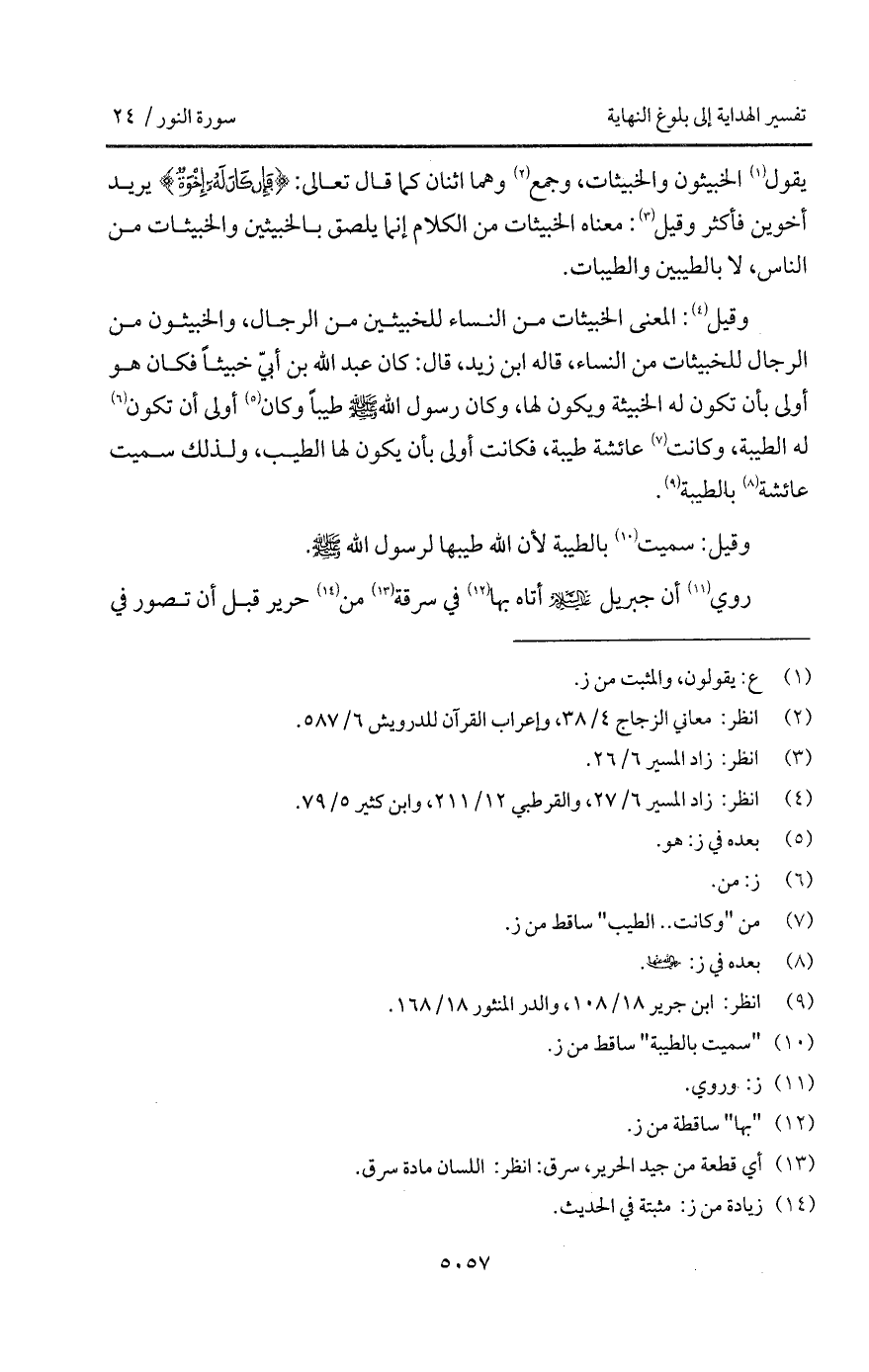 وقيل: المعنى الخبيثات من النساء للخبيثين من الرجال، والخبيثون من الرجال للخبيثات من النساء، قاله ابن زيد، قال: كان عبد الله بن أبيّ خبيثاً فكان هو أولى بأن تكون له الخبيثة ويكون لها، وكان رسول الله A طيباً وكان أولى أن تكون له الطيبة، وكانت عائشة طيبة، فكانت أولى بأن يكون لها الطيب، ولذلك سميت عائشة بالطيبة.