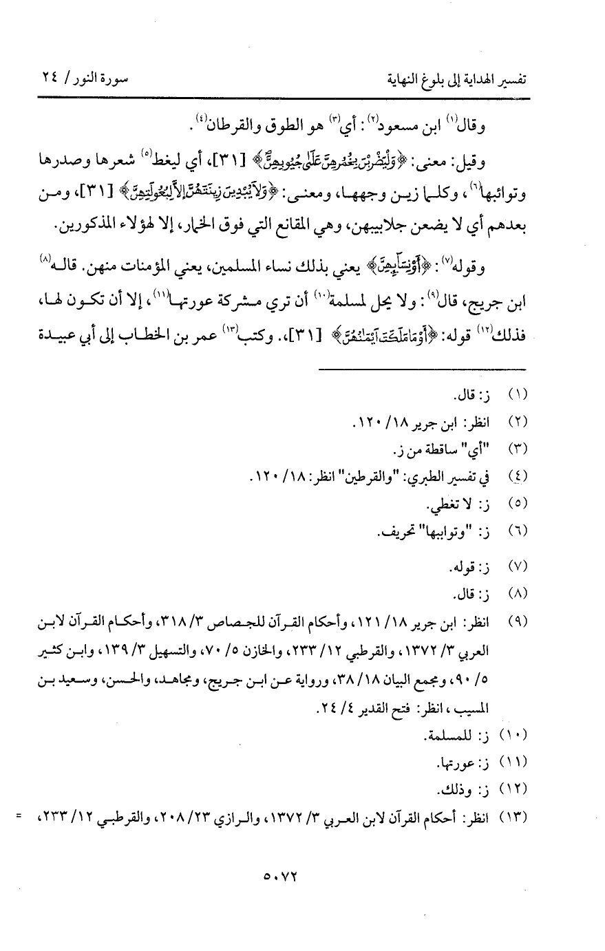 وقيل: معنى: {وَلْيَضْرِبْنَ بِخُمُرِهِنَّ على جُيُوبِهِنَّ}، أي ليغط شعرها وصدرها وتوائبها، وكلما زين وجهها، ومعنى: {وَلاَ يُبْدِينَ زِينَتَهُنَّ إِلاَّ لِبُعُولَتِهِنَّ}، ومن بعدهم أي لا يضعن جلابيبهن، وهي المقانع التي فوق الخمار، إلا لهؤلاء المذكورين.