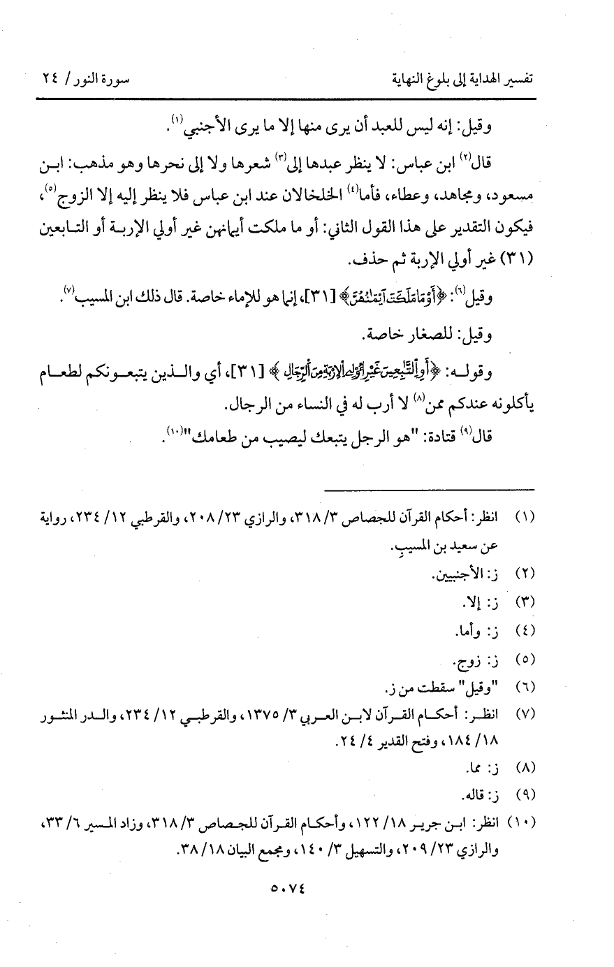 قال ابن عباس: لا ينظر عبدها إلى شعرها ولا إلى نحرها وهو مذهب: ابن مسعود، ومجاهد، وعطاء، فأما الخلخالان عند ابن عباس فلا ينظر إليه إلا الزوج، فيكون التقدير على هذا القول الثاني: أو ما ملكت أيمانهن غير أولي الإربة أو التابعين غير أولي الإربة ثم حذف.