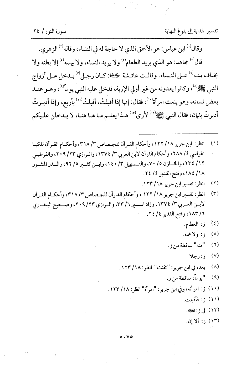قال مجاهد: هو الذي يريد الطعام ولا يريد النساء، ولا يهمه إلا بطنه ولا يخاف منه على النساء. وقالت عائشة Bها: كان رجل يدخل على أزواج النبي A، وكانوا يعدونه من غير أولي الإربة، فدخل عليه النبي يوماً، وهو عند بعض نسائه، وهو ينعت امرأة، فقال: إنها إذا أقبلتْ بأربع، وإذا أدبرتْ أدبرتْ بثمان، فقال النبي A لأرى هذا يعلم ما ها هنا، لا يدخلن عليكم