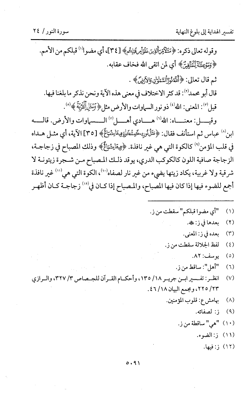 وقيل: معناه: الله هادي أهل السماوات والأرض قاله ابن عباس ثم استأنف فقال: {مَثَلُ نُورِهِ كَمِشْكَاةٍ فِيهَا مِصْبَاحٌ} الآية، أي مثل هداه في قلب المؤمن كالكوة التي هي غير نافذة. {فِيهَا مِصْبَاحٌ} وذلك المصباح في زجاجة، الزجاجة صافية اللون كالكوكب الدري، يوقد ذلك المصباح من شجرة زيتونة لا شرقية ولا غربية، يكاد زيتها يضيء من غير نار لصفاه، الكوة التي هي غير نافذة أجمع للضوء فيها إذا كان فيها المصباح، والمصباح إذا كان في زجاجة كان أظهر
