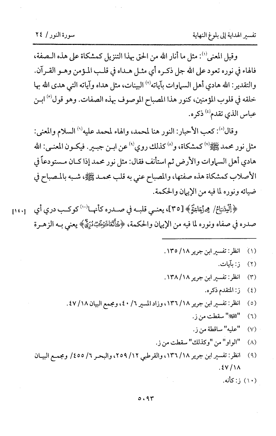 وقال: كعب الأحبار: النور هنا لمحمد، والهاء لمحمد عليه السلام والمعنى: مثل نور محمد A كمشكاة، وكذلك روي عن ابن جبير. فيكون المعنى: الله هادي أهل السماوات والأرض ثم استأنف فقال: مثل نور محمد إذا كان مستودعاً في الأصلاب كمشكاة هذه صفتها، والمصباح عني به قلب محمد A، شبه بالمصباح في ضيائه ونوره لما فيه من الإيمان والحكمة.