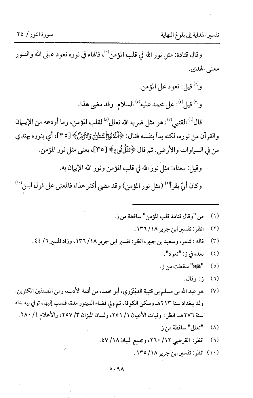 قال القتبي: هو مثل ضربه الله تعالى لقلب المؤمن، وما أودعه من الإيمان والقرآن من نوره، لكنه بنفسه فقال: {الله نُورُ السماوات والأرض}، أي بنوره يهتدي من في السماوات والأرض. ثم قال {مَثَلُ نُورِهِ}، يعني مثل نور المؤمن.