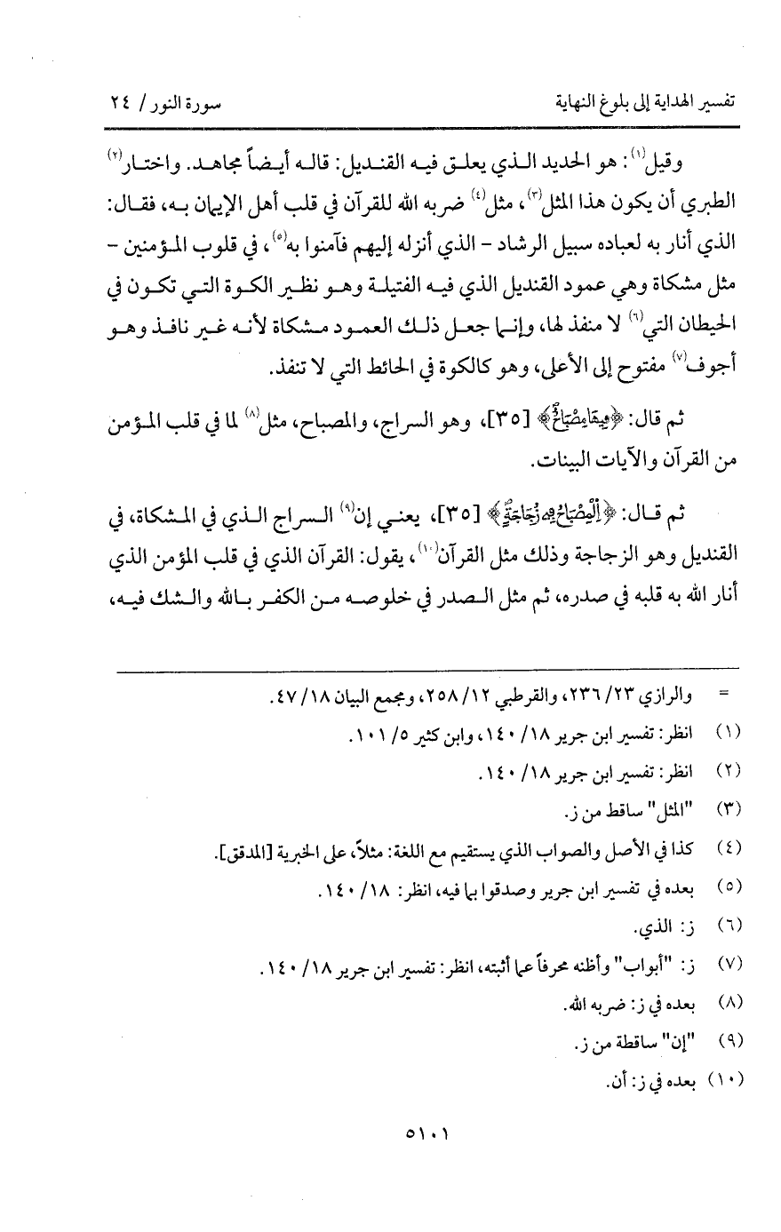 وقيل: هو الحديد الذي يعلق فيه القنديل: قال أيضاً مجاهد: واختار الطبري أن يكون هذا المثل، مثل ضربه الله للقرآن في قلب أهل الإيمان به، فقال: الذي أنار به لعباده سبيل الرشاد - الذي أنزله إليهم فآمنوا به، في قلوب المؤمنين - مثل مشكاة وهي عمود القنديل الذي فيه الفتيلة وهو نظير الكوة التي تكون في الحيطان التي لا منفذ لها، وإنما جعل ذلك العمود مشكاة لأنه غير نافذ وهو أجوف مفتوح إلى الأعلى، وهو كالكوة في الحائط التي لا تنفذ.